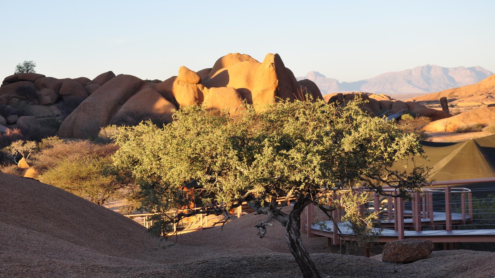 “A sense of place in an archaeological landscape” The Barnard Family is honored to welcome you to Spitzkoppen Lodge. The same owners and developers of Kalahari Bush Breaks Lodge, have the privilege to share their dream come true of an exclusive destination on the edge of the Namib Desert, which started some 14 years ago. You are invited to indulge in the pleasure and passion for friendly service in a relaxed ambiance. The lodge is situated on the northern periphery of the Spitzkoppe inselberg, between huge granite boulders, which were created more than 150 million years ago, with breath-taking views onto the Brandberg and Erongo Mountains. The stylish, private accommodation consists of 15 spacious, tastefully furnished chalets, each with a private bathroom and outside viewing deck, which connects the guest with the vast stretches of untouched sand and boulders beyond. Situated on the inland edge of the Namib Desert, the climate of the Spitzkoppe Conservation Area is arid, with a mean annual rainfall of 50mm and a high evaporation rate of 3200mm per annum. Most rainfall occurs between January and April, and with the granite outcrops being impermeable, rainfall-runoff collects at the foot of the outcrops creating unique micro-habitats for woody plants to grow in an otherwise arid area.